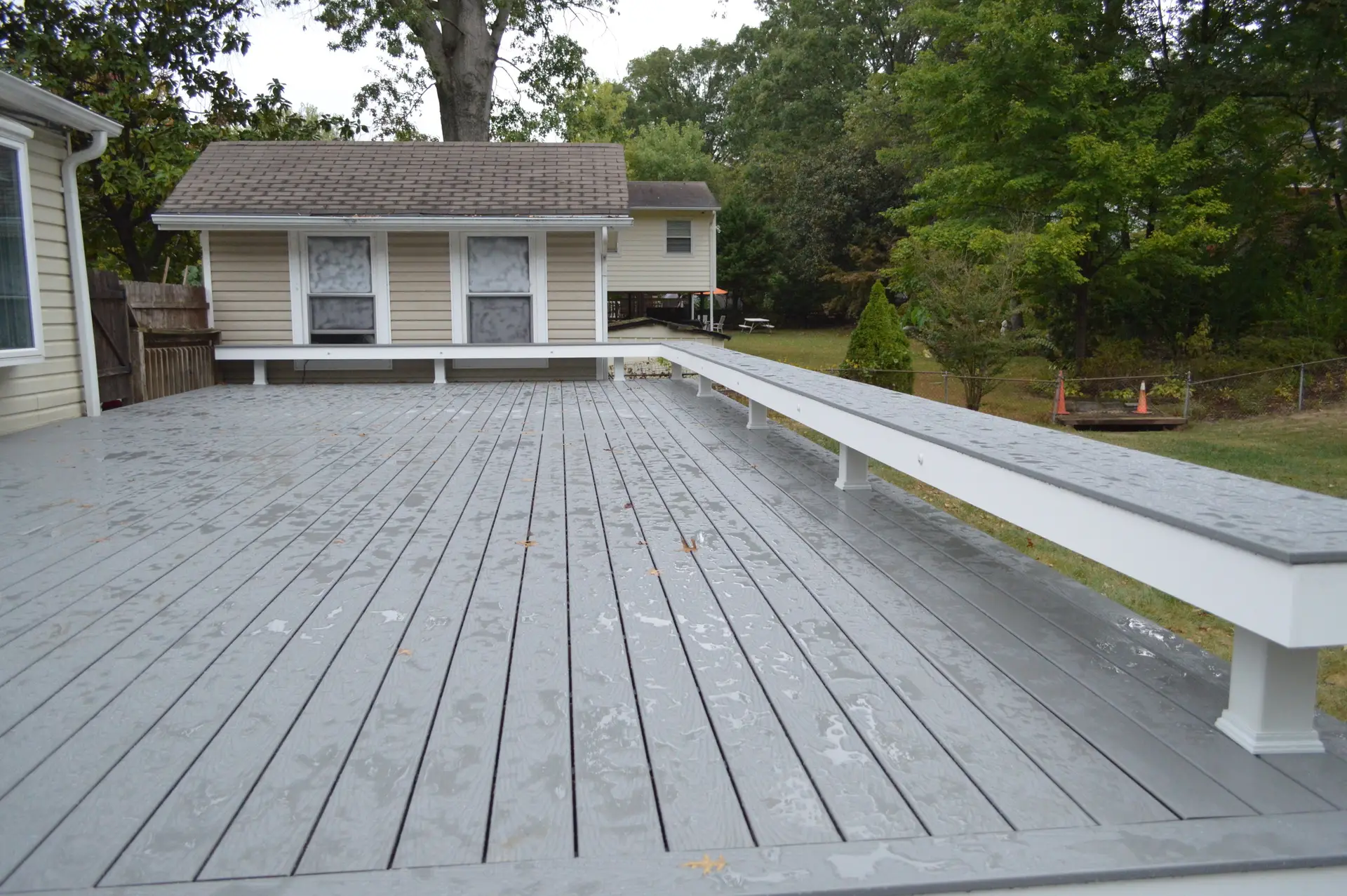 We install deck waterproofing systems and proper drainage to prevent water accumulation and wood rot, especially on elevated deck builds.